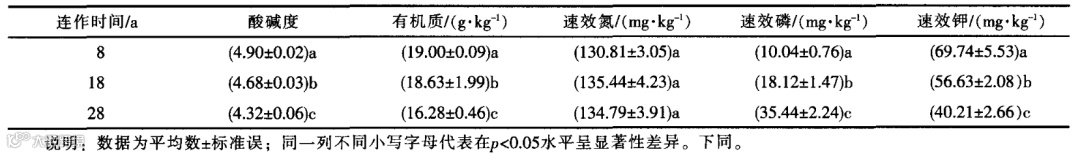 由表1可知,随着种植年限增加,土壤pH和有机质含量均呈显著下降趋势,其中8~18a(年)和18~28a(年)阶段土壤pH分别下降0.22和0.36个单位,有机质含量分别减少0.37g/kg和2.35g/kg,表明土壤pH和有机质含量随连作时间增加,受影响程度越大,土壤速效磷呈上升趋势,速效钾则下降趋势,而速效氮含量无显著差异,这可能与胡椒施肥过程中施入的氮磷多而钾肥少,引起连作胡椒园土壤养分失衡有关。