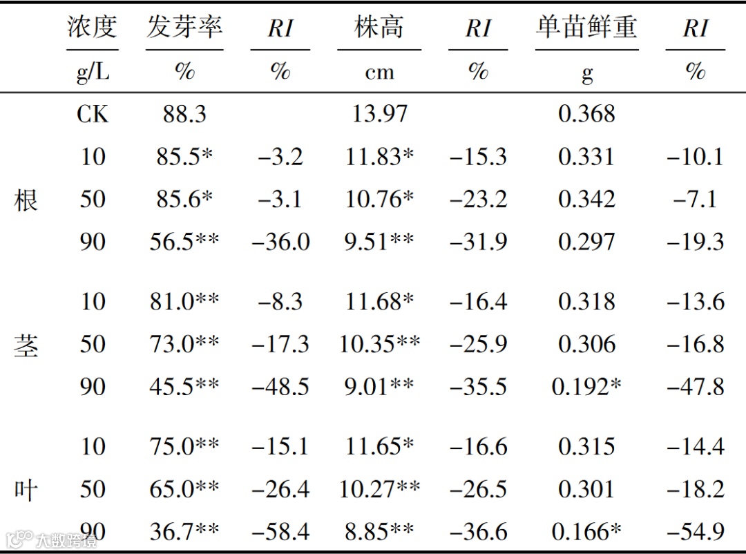 其中,叶水浸液对种子萌发、株高单苗鲜重的抑制率分别为58.4%、36.6%、54.9%,其抑制作用达显著或极显著水平,茎水浸液的抑制率为48.5%、35.5%、47.8%,根水浸液的抑制率为36.0%、31.9%、19.3%,即抑制作用叶>茎>根。