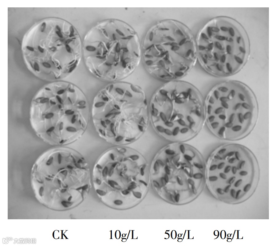 哈密瓜同一种器官不同浓度的水浸液处理效果不同。以叶水浸液为例,对照处理时,哈密瓜种子的发芽率最高(88.3%),以10、50、90g的溶液分别处理时,哈密瓜种子的发芽率分别为75.0%、65.0%、36.7%;抑制率分别为15.1%、26.4%、58.4%(表1,图1),即随浓度升高,对种子发芽率的抑制作用渐高,种子的发芽率逐渐下降(图4、图5)。和对照相比,种子发芽率在叶水浸液浓度为10、50、90g/L 3种浓度范围内都表现为差异极显著(P<0.01)。