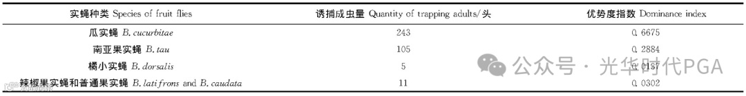 3、使用大棚防虫网和塑料薄膜的物理隔离, 棚内实蝇害虫种群数量较低, 结合及时处理受害瓜等农业措施的方法, 杜绝受害果内这部分害虫发育成熟、羽化后重返瓜棚, 同时棚外实蝇害虫不易迁入, 对瓜实蝇和南亚果实蝇的种群抑制在短期内有明显效果。