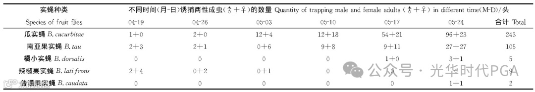 冬春茬结果期为3—5月, 此时岛内的瓜实蝇、南亚果实蝇和橘小实蝇随气温升高对各产区大棚哈密瓜为害也开始日趋严重, 为此, 林明光等开展了海南反季节大棚哈密瓜园实蝇害虫种群动态和综合防治初步研究, 为科学制定热带瓜菜园实蝇害虫的防控措施提供参考依据。