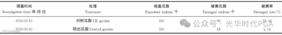 冬春茬收获期, 对照园按日常管理喷施农药, 防治试验园不喷施农药, 以悬挂诱剂诱捕器和捡落果进行防治。以防治试验园哈密瓜被害率的下降值作为防治效果的主要依据。