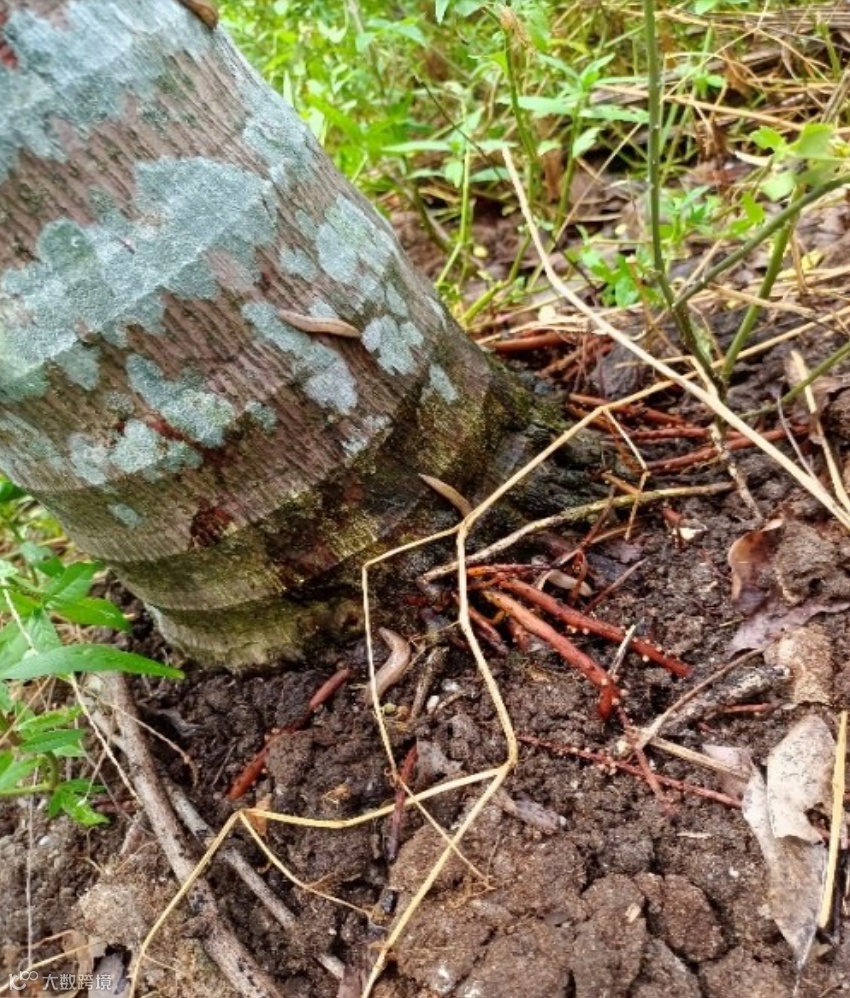 双线嗜粘液蛞蝓昼伏夜出,雨季活动更加频繁,危害更为严重,常常傍晚5点左右出来,直至次日9时左右;若在温度低于30°C的阴雨天气,蛞蝓整天可见伏着于从槟榔根部并向上爬(图4),进而危害叶鞘、花苞和心叶;白天,蛞蝓一般潜伏于草丛中、土壤下、叶鞘内侧和槟榔心部里层。