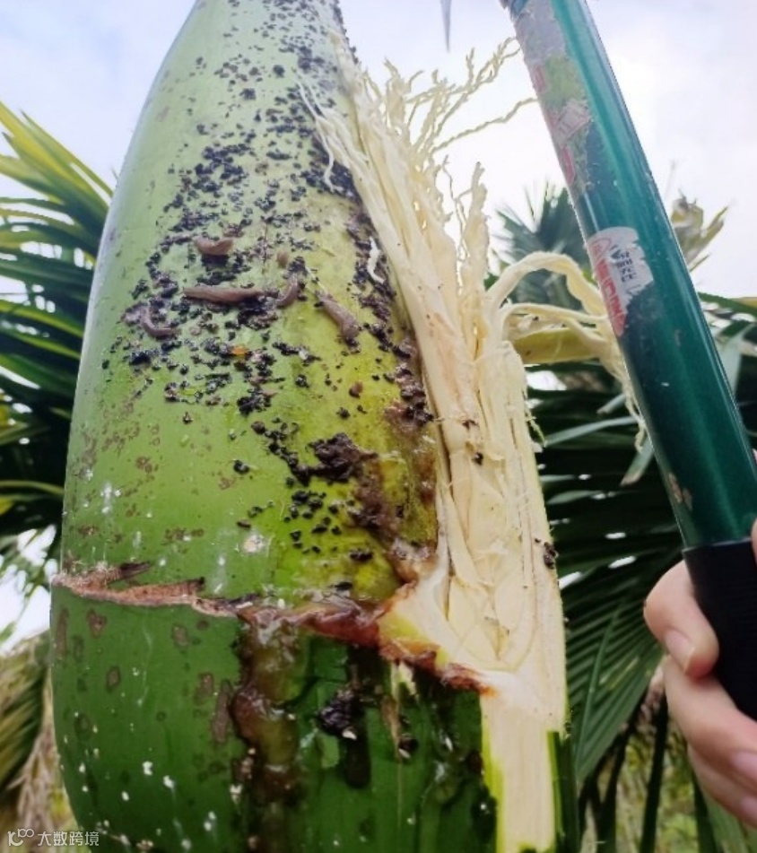 危害叶鞘时,多藏匿于叶鞘内侧危害,导致叶鞘内侧腐烂(图2、3),病原微生物趁虚而入,侵染花穗,直接影响槟榔产量。