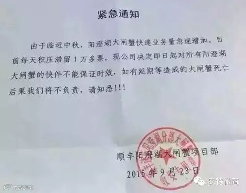 不管是大闸蟹的生鲜电商、还是微商,打着发顺丰的旗号,本来是想赢得客户的认可,赢得更多的订单,但实际上背后就过度的依赖顺丰了。一旦订单暴涨,结果如下: