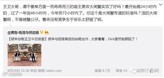 这几天大闸蟹导致物流瘫痪互联网社交圈满屏皆是,怨声四起。这次吐槽的不是三通一达,而吐槽的是顺丰,一向以“快物流”著称顺丰这次被大闸蟹搞瘫痪了,大量的粉丝吐槽顺丰也快不起来了。