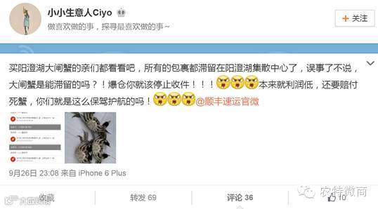 4、利润都给快递赚了,还不对物流负责。整体来说,顺丰的价格不便宜,基本上是江浙沪20元/单(箱)、江浙沪之外40-50元/单(箱)。对于做大闸蟹电商和微商的朋友来说,本来利润就不高,不少利润其实帮顺丰赚钱了。