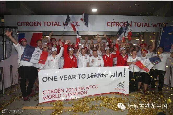 统治拉力赛多年后,今年是雪铁龙车队首次进军WTCC世界房车锦标赛,截止到目前,雪铁龙车队以927分雄踞积分榜榜首提前夺冠,车手洛佩兹也以422分的优势提前加冕WTCC年度车手总冠军,双冠王的完美战绩为雪铁龙的WTCC征程画上浓墨重彩的一笔。WTCC上海站庆祝时团队更是将海报上的“ONE YEARTO LEARN”标语改成了“ONE YEAR TO WIN!”