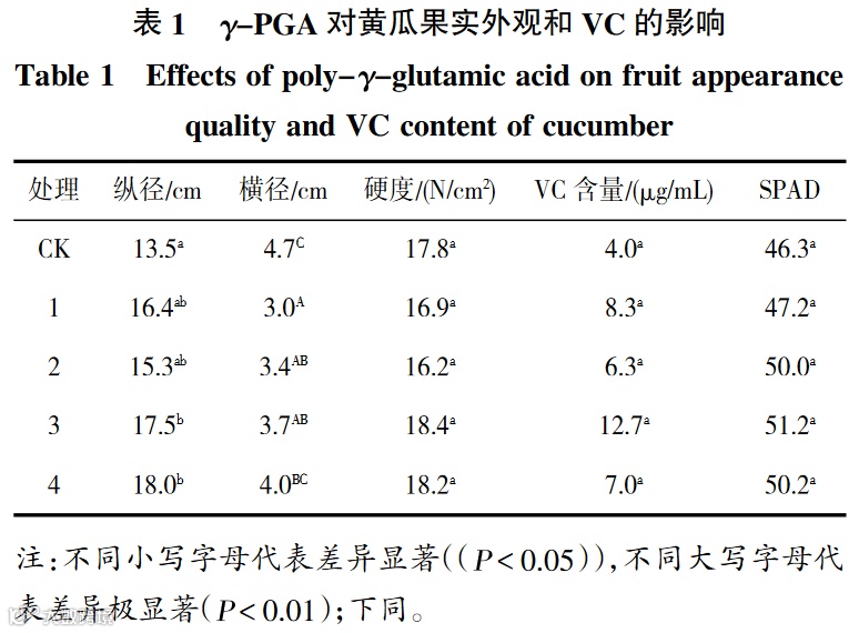 图1显示了进行γ-PGA试验后的黄瓜果实特征。由图知,对照组果实短小,形状不规则,处理3和处理4的果实较对照有显著增长,果实的均一性也明显更好。