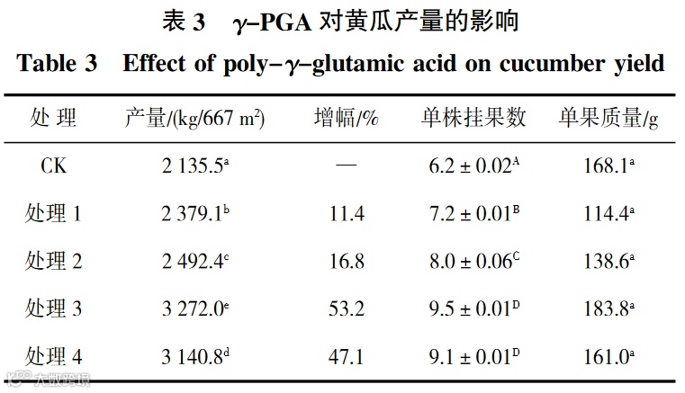 由表3可知,4种γ-PGA处理的黄瓜单位面积产量均高于对照,各处理组相较于对照组的增幅分别为11.4%、16.8%、53.2%、47.1%,从处理3和处理4结果可以看出,产量随着γ-PGA处理的浓度增加而增加,因此PGA处理对黄瓜有明显的增产效果。4种处理后的单株挂果数与对照组相比均有增加,且均达到差异极显著水平。但处理1、2和处理4处理后的黄瓜单果质量有所下降,而处理3的单果质量相比于对照组有所增加,综合效果是单株挂果数增加,果实适当地减小,但果实的均一性更好。