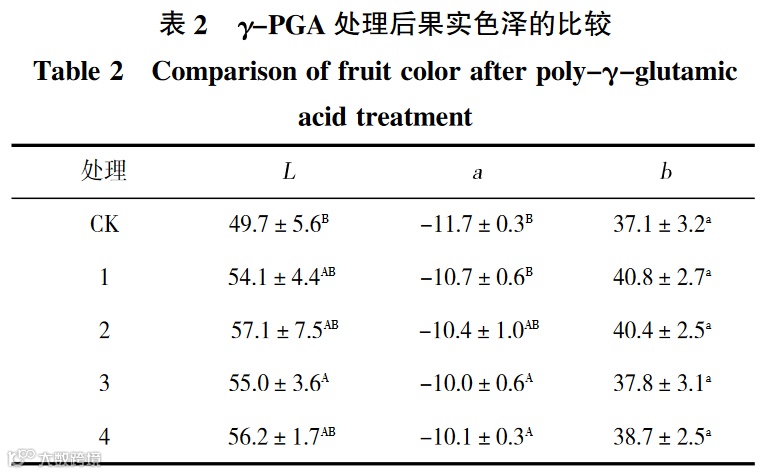 与对照相比,处理3(复合肥配施150mL/L、3.5%的γ-PGA发酵液)和处理4(复合肥配施300mL/L、3.5%的γ-PGA发酵液)能使果实长度增加,果形均匀一致,亮度增加,果实表面更富有光泽,果实产量提高;