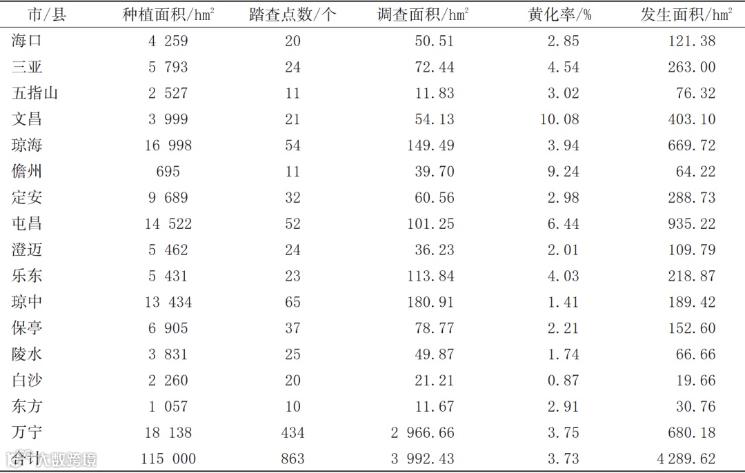 表1 海南省各市县槟榔生理性黄化率及发生面积