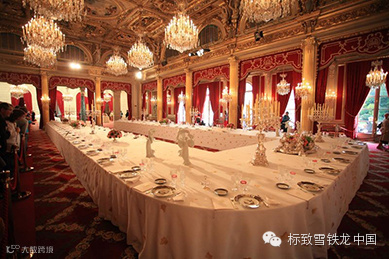 爱丽舍宫的历任主人都很注重国宴的餐桌艺术,这是展现法国文化和习俗的窗口。国宴是在专门接待宾客的节庆厅进行,宴台面为 “U”形设计,四周装饰得金碧辉煌,极尽奢华。130年多来,爱丽舍宫盛大国宴的豪华程度与繁复礼节几乎不曾改变。餐桌上,除了久负盛名的各式法国大菜之外,所用的餐具、餐巾也都是来自法国著名制造商,其中大部分是专门为爱丽舍宫设计制作,在市场上是买不到的。