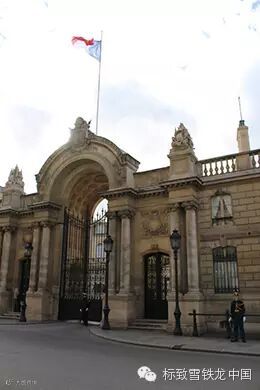 爱丽舍宫的大门上迎风高高飘扬着蓝、白、红三色法国国旗,门楣标有醒目的"FR"两个字母,是法兰西共和国国名的缩写,门前站着守卫大门的卫兵,门外是福布尔圣欧诺雷大街。