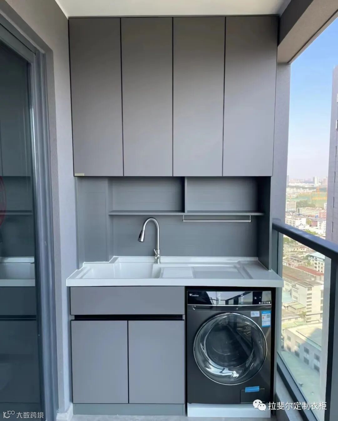 可以将阳台设置成洗衣区,然后定制通顶的储物柜,这里可以收纳各种清洁用品、洗衣液等,甚至清洁工具也可以收纳于此。阳台还可以晾晒,集多种功能于一体,非常的方便实用。