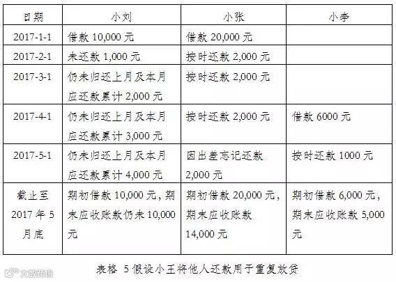 为了进一步说明指标扭曲程度,我们在案例的基础上追加一些数据。假设小王不仅借给小刘与小张,还将小张的还款金额6,000元继续借给小李,共分6期,每期还款1000元,同样是每月1日还款: