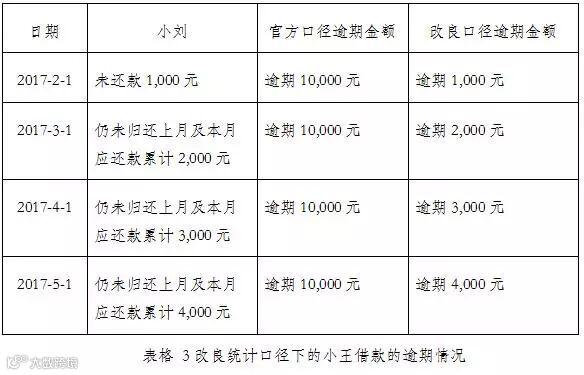 按照这个口径,很明显小王的借款在2月的时候逾期金额已经达到了10,000元而不仅仅只是1,000元这么一个小小的数字。表格1的状况进一步变化为了表格2。