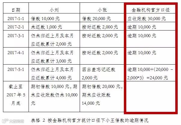 看完表格2,可能大家会觉得小王的这两笔借款好悲催,3万元的借款,第二个月就有1万元(33%)的可能损失;有些看官可能会有个疑问,在2月的时候虽然小刘一个月没有还钱,但小刘接下来是否还钱还是未知,用这样的统计口径是否过于悲天悯人了呢?