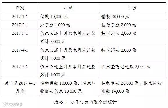 在接下来的四个月,小刘始终拖欠还款,小张基本每月按时还款,但在5月因出差忘记还款,下表就从现金流的角度来做了一张表格: