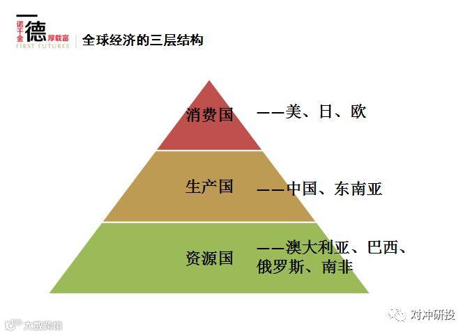 欧,日,美这三国作为一个消费国他们应该属于金字塔塔尖的国家,中国作为一个生产国包括东南亚地区包括印度也是生产国,作为一个中间环节。下面是资源的国家。所以这张图说明就是这三个类型的国家的经济状况整体走好以后才有可能出现大的牛市。