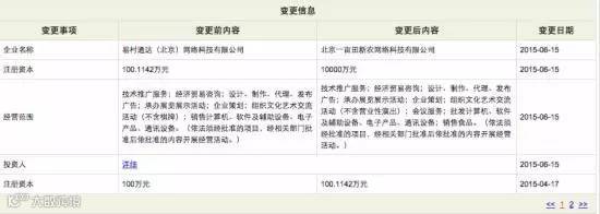 根据全国市场主体信用信息公示系统的信息,一亩田法人主体是:北京一亩田新农网络科技有限公司,成立于2011年8月1日,注册资本金为1亿元人民币,注册地址为“北京市海淀区知春路6号锦秋国际大厦7层B03室”。根据公示信息,该公司前身为“易村通达(北京)网络科技有限公司”,原来的注册资本金为100万元,在2015年6月15日刚刚变更为1亿元,并将公司名称改为“北京一亩田新农网络科技有限公司”。