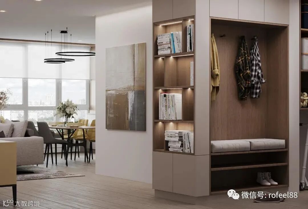 玄关处设计整墙玄关柜,中部做挂衣区,下方放日常拖鞋。空间利用恰到好处,旁边储物格放书本增加文艺气息,嵌入灯带,光线充足。集书柜、换鞋凳与衣帽间为一体的玄关柜,将所有功能融入其中,做到小空间大制作。