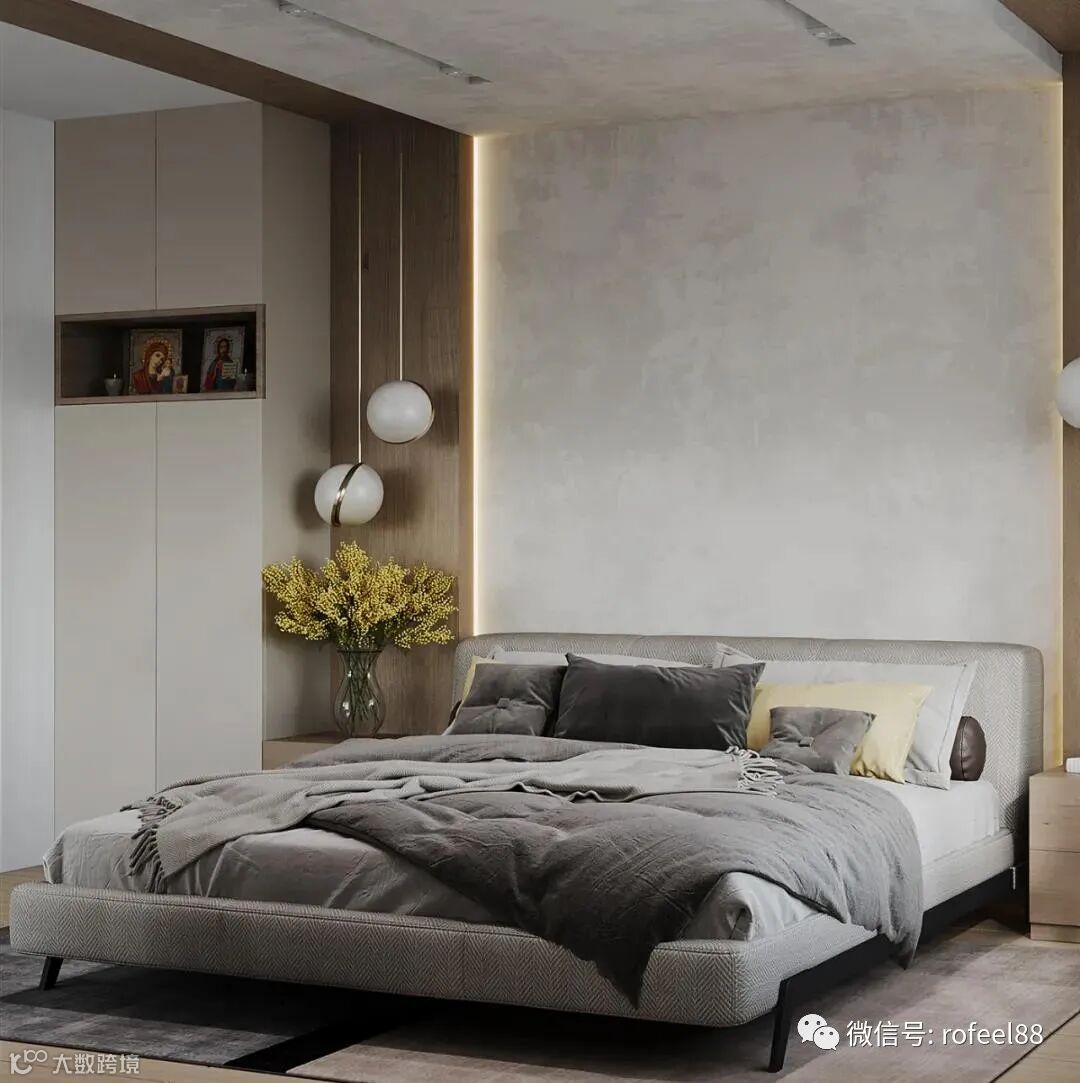主卧室简约大方,床头摆放一束花起到了很好的装饰效果。加以白色肤感饰面和灰色床品穿插,迎合了当下追求轻感、简约化的家装设计。