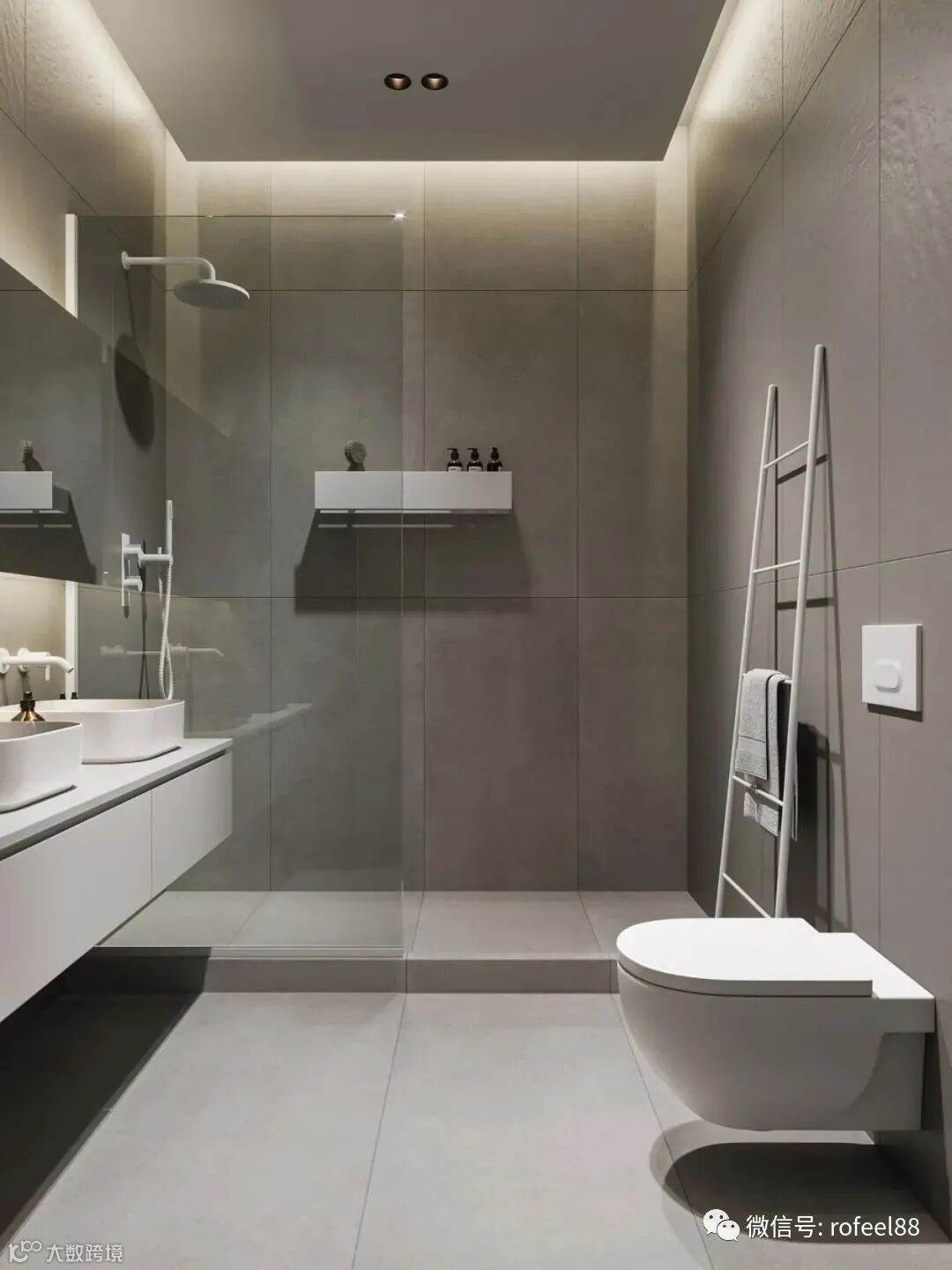 卫生间的设计与其他地方不太一样,以灰色为主调,依然是极简风。洗漱区与淋浴区用玻璃隔开,悬空的马桶降低了清洁难度,打扫更加方便。