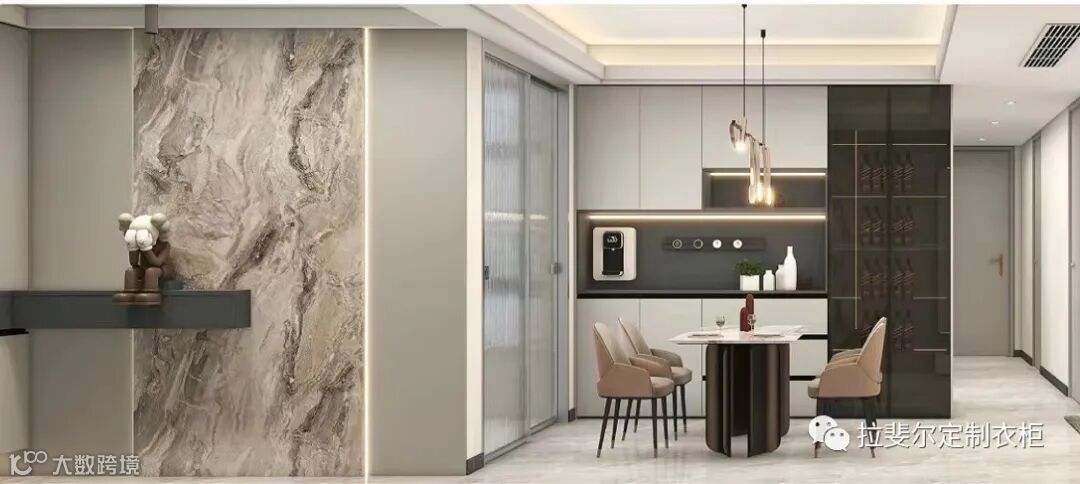 全屋定制家具当中客餐厅部分包含的就多了,比如餐厅中餐桌椅、餐边柜、酒柜、展示柜、卡座设计等等,客餐厅隔断柜、博古柜,客厅中的电视背景墙柜和电视柜、沙发、茶几、沙发背景书柜等,在这些区域巧妙的设计感在功能组合空间利用上发挥出来,使空间美观和实用得到完美诠释。