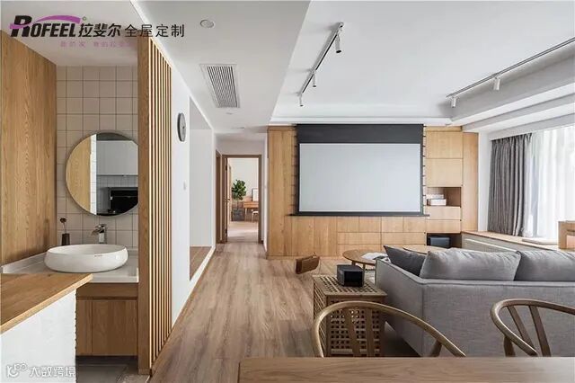客厅不想放电视机的,不如定制全封闭电视柜,然后再安装上投影幕布。想看大片直接把幕布放下来看,在家也能感受到电影院的气氛!