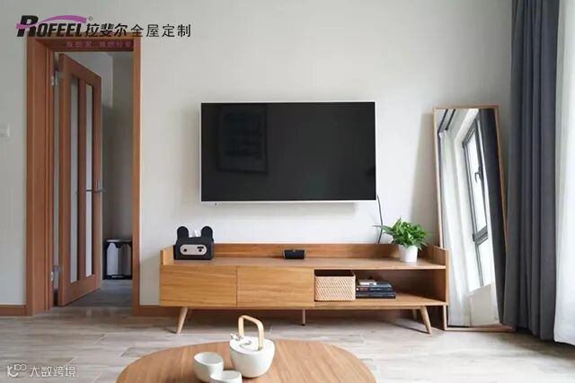 对收纳需求较低的家庭,还可以选择一字型电视柜。搭配背景板,效果更佳。悬空设计,留出扫地机器的经过的空间,非常方便实用呢!
