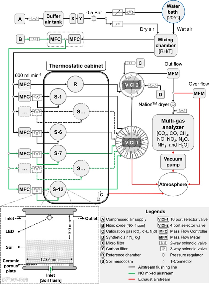 文章指出,过去探究外源气体(如 NO)对土壤过程的影响,最大的阻碍是缺乏能同时精准控制背景气体,并连续测量多组分微量气体通量的实验装置。为此,研究团队自主创新设计了一套高度自动化的12 气室土壤微生态模拟系统。在最大程度还原真实土壤微环境的基础上,实现了大批量、多变量的高通量对照实验。
