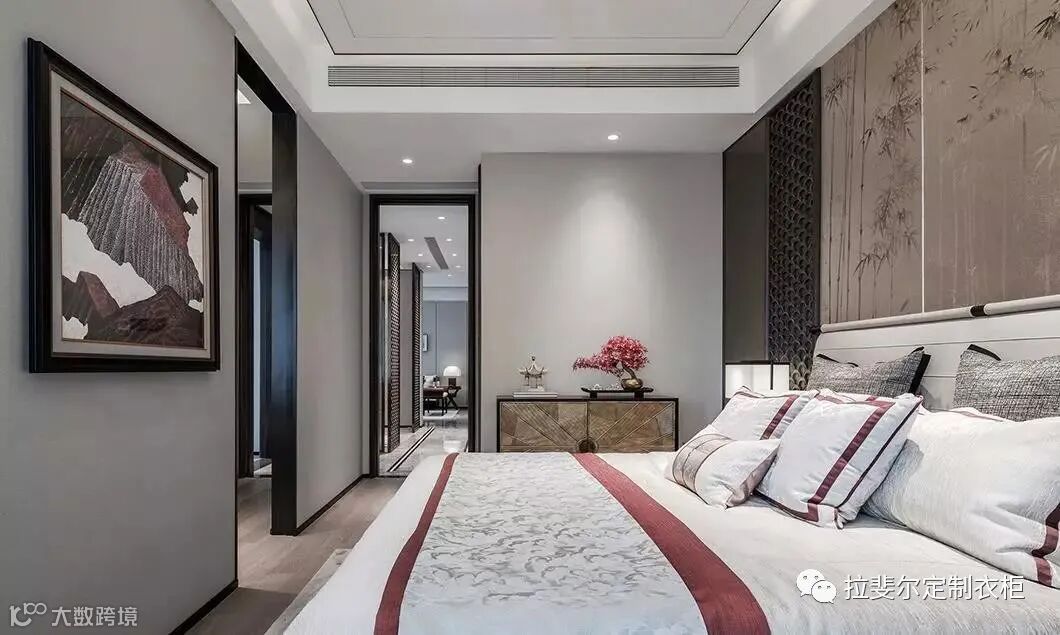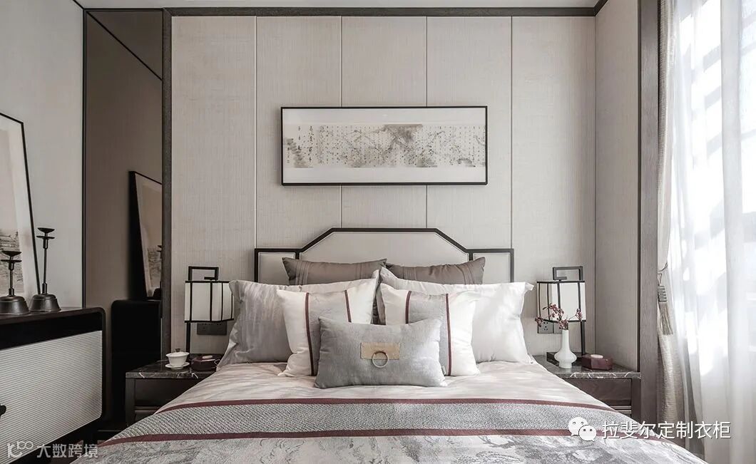 卧室是我们心灵的归处,是我们休息的地方,累了就安心睡一觉。床头背景墙是一副山水画,体现了屋主对国画的喜爱之情。看着古韵十足的卧室,在快节奏的工作后享受着悠然见南山的美好。