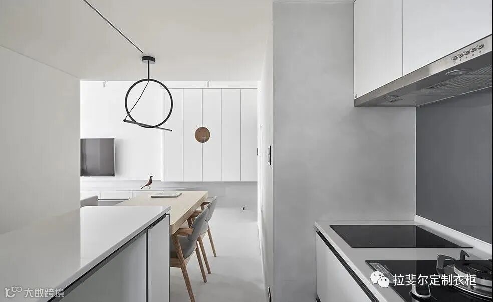 厨房采用开放式设计,不仅增加了可利用空间还增加了互动性,大中岛和餐桌连接,增加操作台面,下方还可嵌入洗碗机等电器,一举多得。