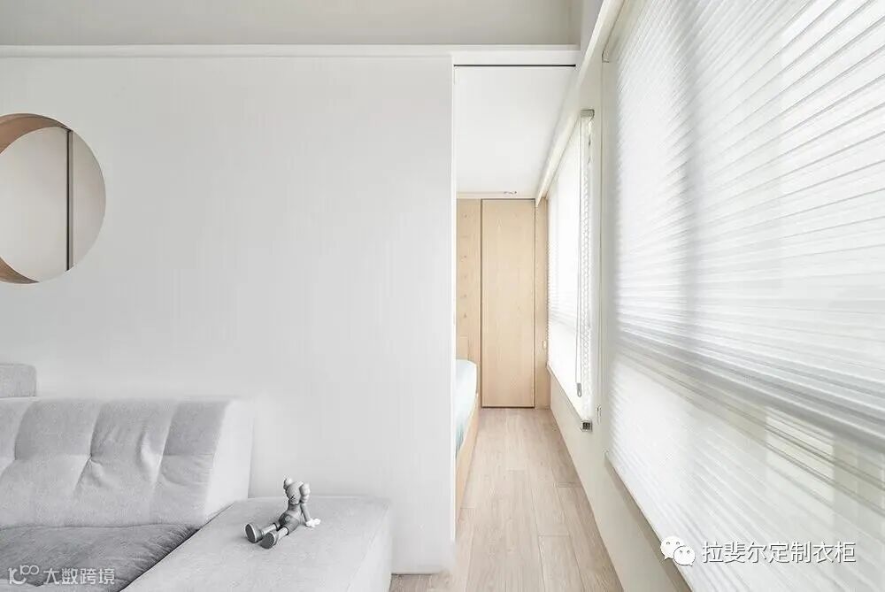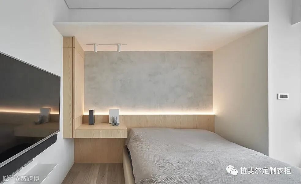 床尾定制的衣柜,让卧室有充足的储物空间。正所谓麻雀虽小,五脏俱全。