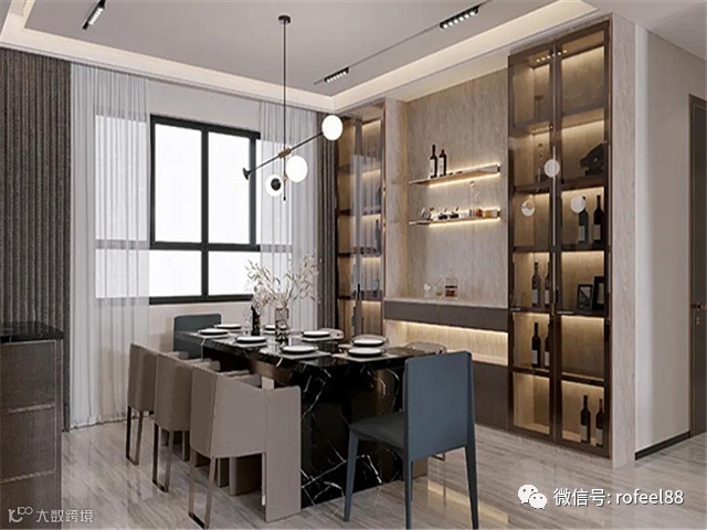 精致生活源于对细节的执着与追求,客餐厅利用餐边柜与玄关一体化设计,划分出一个独立的西厨与美酒收藏空间。节假日一家人小酌一杯,其乐融融!