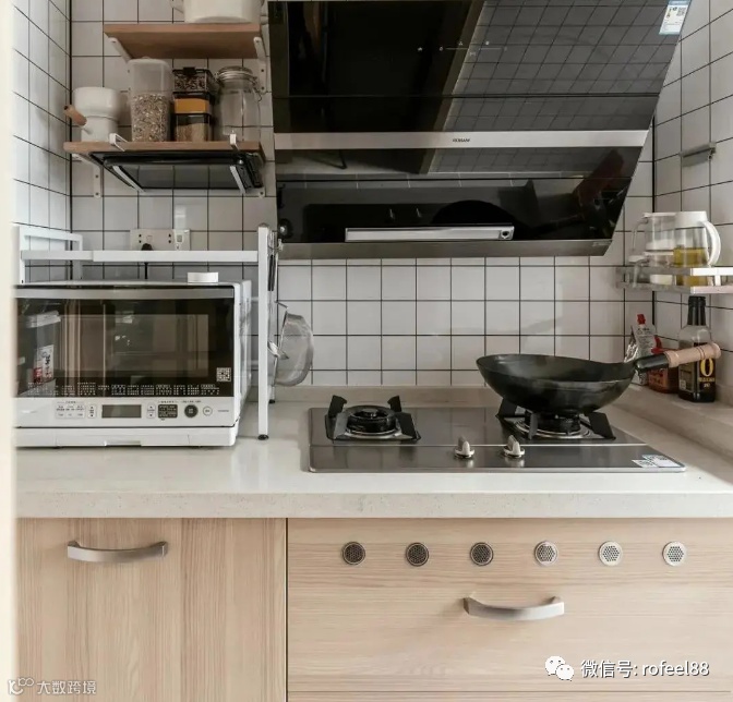 厨房定制原木色橱柜,上面用大理石做台面。墙面铺贴小方砖,更有时尚感。墙面空间没有浪费,装上搁物架放置各种瓶瓶罐罐,非常实用。
