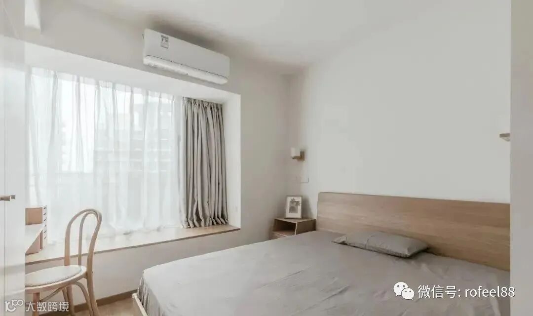 主卧室给人的感觉很纯粹,简简单单的设计富有质感。梳妆台放在床头,也可以用作书桌使用。白色和原木搭配,十分养眼,颜值很高。