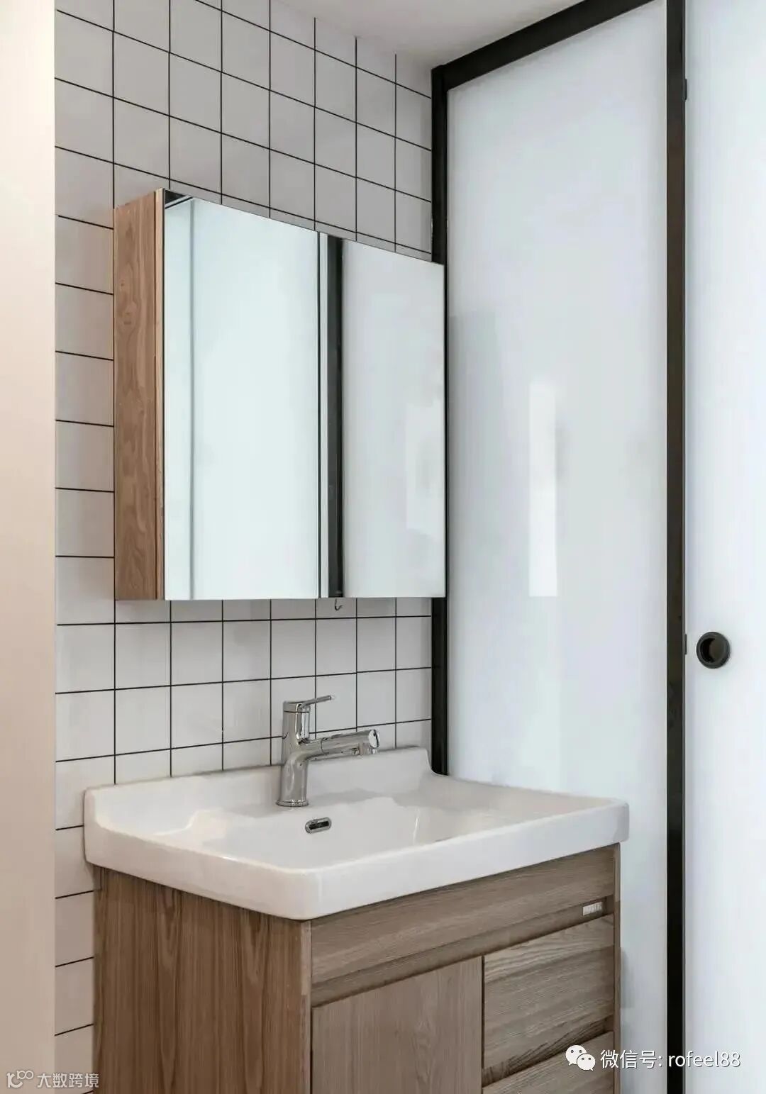 浴室的设计相对紧凑,有四个隔板,水槽和镜子柜负责日常用品的存放。洗衣机和烘干机位于脸盆的另一侧,卫生间和淋浴间也是分开的空间,允许多个区域同时工作。