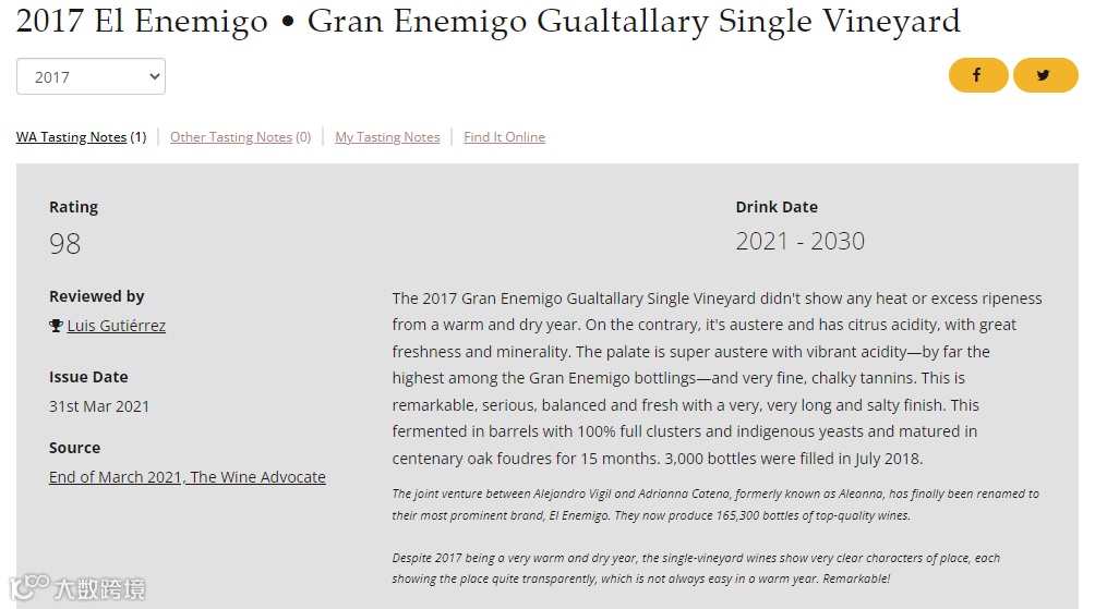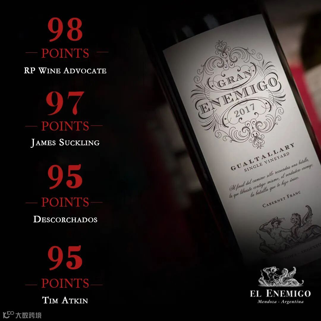 那款让艾尼米格(El Enemigo)品牌,名声鹊起且稳固阿根廷膜拜酒地位的全球首个获得Robert Parker满分的品丽珠——Gran Enemigo Gualtallary Cabernet Franc,继满分年份2013及随后的2014之后,2017年份也带着高度赞誉到货了。