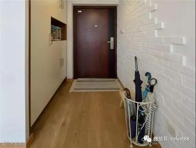 玄关的另一侧则是做成了北欧风的文化砖造型,看起来时尚又耐看,在玄关进入客厅的位置还专门放置了一个造型精致的雨伞架收纳桶,真的很方便有没有。