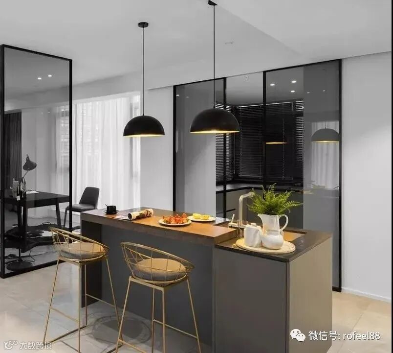 大多数吧台都会设计在客餐厅或者厨房和餐厅之间,吧台充当餐桌的同时,还能起到隔断空间的作用。