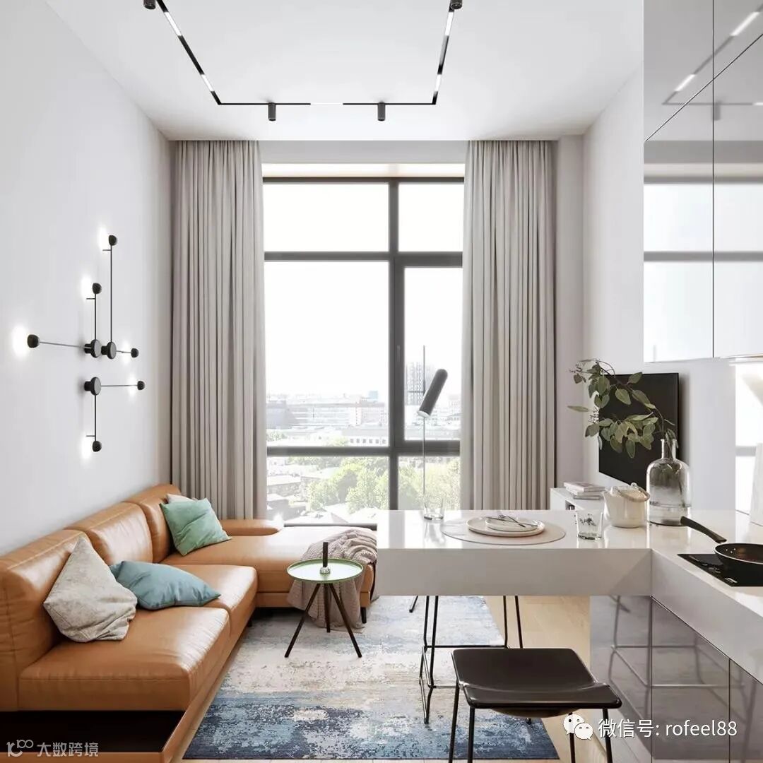 小居室的话,不妨将餐桌、吧台、厨房融合到一起,可以大大节省室内空间。