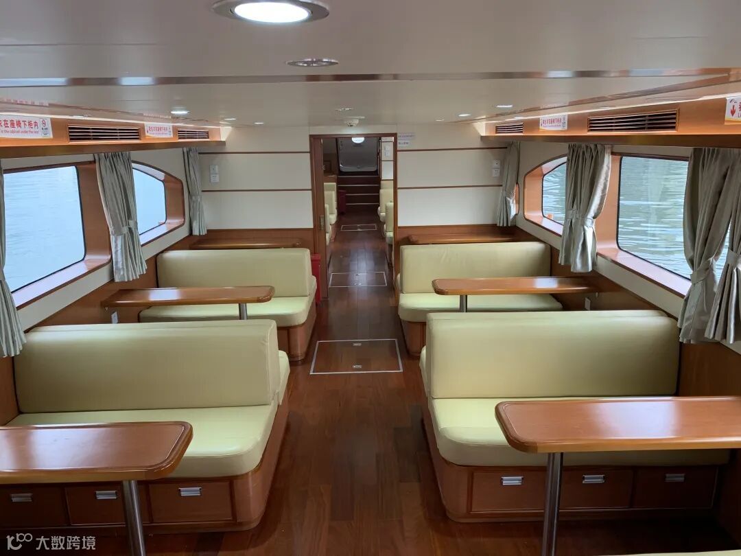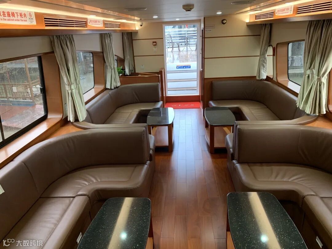 一层观光大厅,分为前后两个区域,配备有高级雅座,船尾为观光走廊。