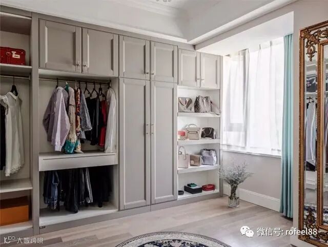 衣帽间的空间比较宽敞,设计师把衣柜放在四周的墙面,中间部分大面积的留空,这个衣帽间也可以作为健身房来使用。