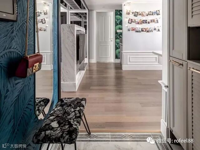 拉斐尔全屋定制来给大家讲讲,我们一进门就可以看到入户玄关一侧的墙面铺贴了蓝色的绿植壁纸,另一侧则定制了嵌入式的鞋柜,再加上换鞋凳和穿衣镜的设计,玄关走廊可以说是非常实用又美观。