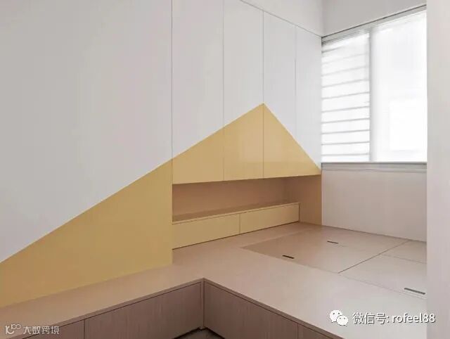 儿童房空间不是很大,做的榻榻米设计,大量的抽屉式设计,可以有效帮助提升空间收纳,让家居收纳不成问题,几何色块增加了空间的活泼与童真。