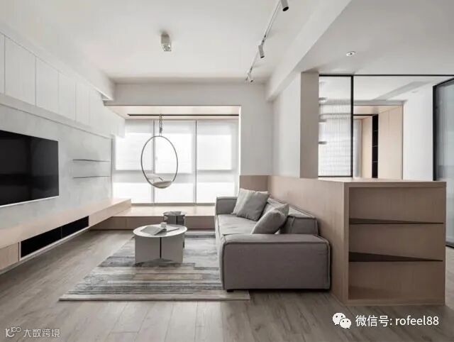将阳台区域划分给客厅之后,便将阳台空间做成了地台式设计,地台侧面做了抽屉,家里的储物量很是庞大,拿取也很方便,再也不用担心物品没有地方收纳了,阳台区域还做了一个吊篮,平时休闲时分可以坐在这里小憩片刻,或者欣赏一下窗外的美好风光都是非常不错的。