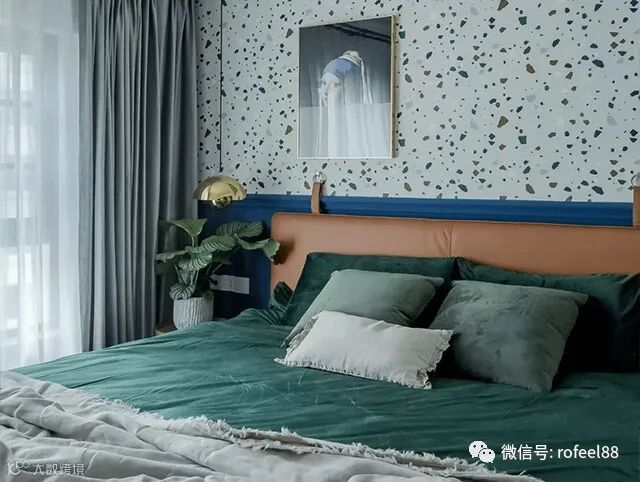 主卧,水磨石状的色彩斑点有如画家随性的笔触,并辅以绿植盆栽营造轻松、舒适的空间氛围。在公区设计格调的基础上,加入了装饰画增添艺术的情调,蓝色与水磨石拼色墙面赋予空间独特气质。床尾设计了女主人想要的梳妆台,同时加入一组挂壁抽屉,增强空间的收纳性,又便于打理。胡桃木材质搭配墨绿色空间,散发出一丝复古气息。