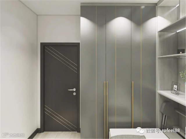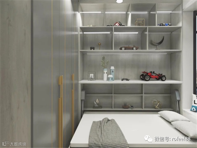 第三套房是男孩房,设计师采用烟灰色为主色调,打造出暗黑酷炫的设计风格,让孩子在日常的生活中也能感受到愉悦。不足8㎡的空间,要将学习、储物、休息等功能区安排妥当并不简单。设计师设计了衣柜+储物柜+侧翻床一体式设计,将空间利用最大化,实现了孩子需要的所有功能。衣柜和储物柜全部做到顶,收纳能力一点不输大户型!该房的主人是一个寄宿中学生,考虑到这一因素,设计师将床设计成侧翻床,收起时不积累灰尘,放下也很方便,孩子节假日回家小住更省心。想要追求休闲娱乐,这些设计师也都考虑到了。所以在房间转角处打造了极致享受的影音区,电脑桌上方还打了一排吊柜,方便收纳桌面杂物,毕竟干净整洁的桌面才能让居住效果更佳!